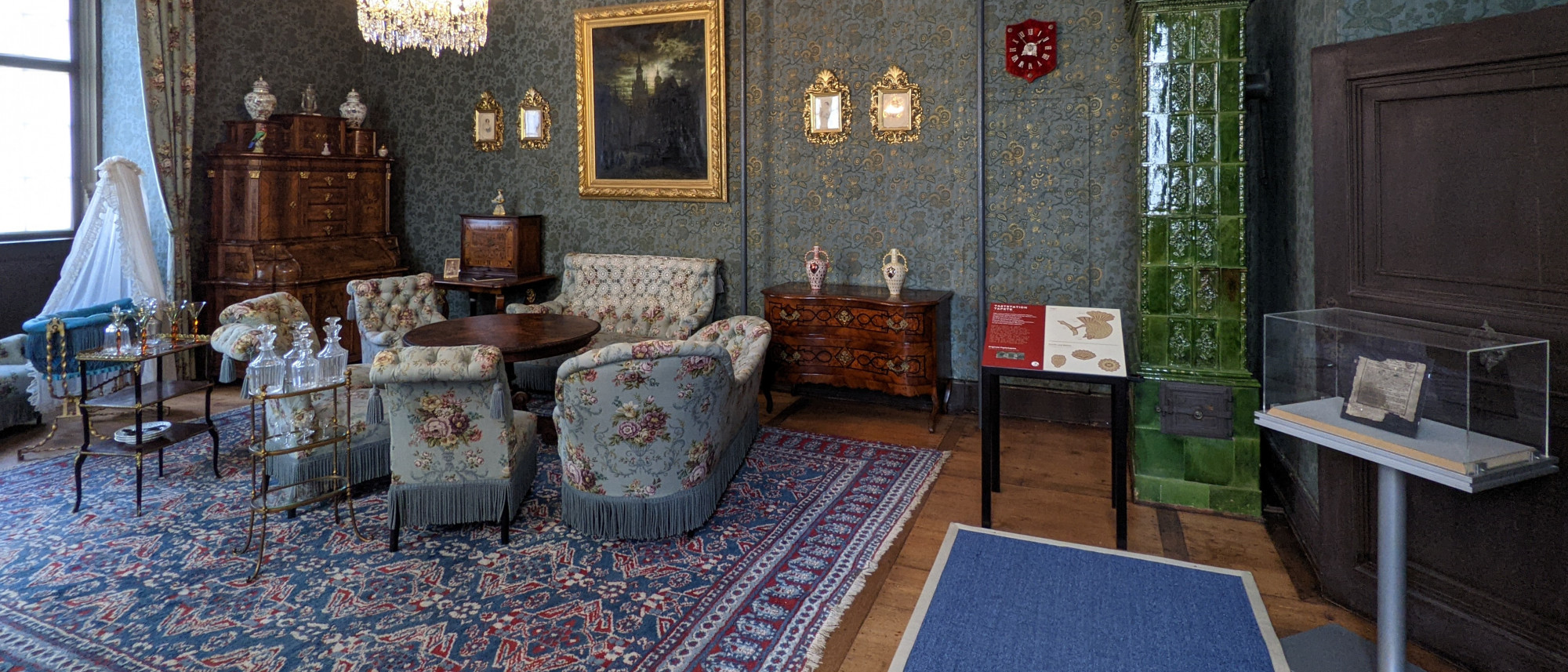 Auf das Tauschobjekt in den Museen Schloss Aschach treffen Sie im Blauen Salon des Graf-Luxburg-Museums.
