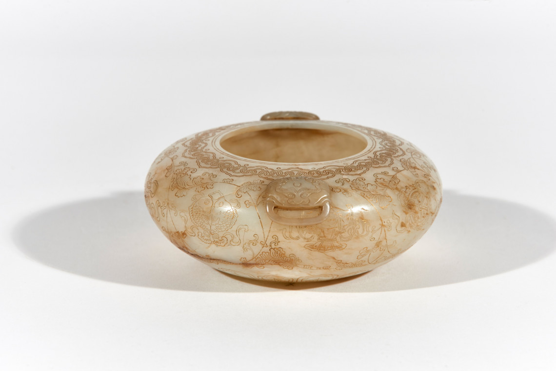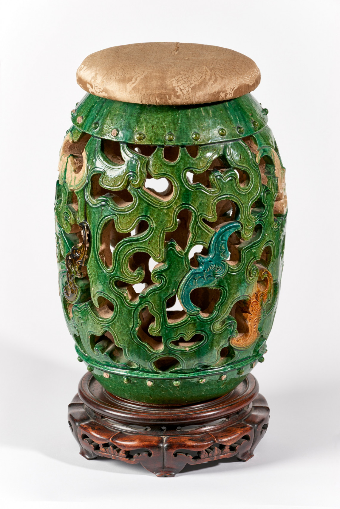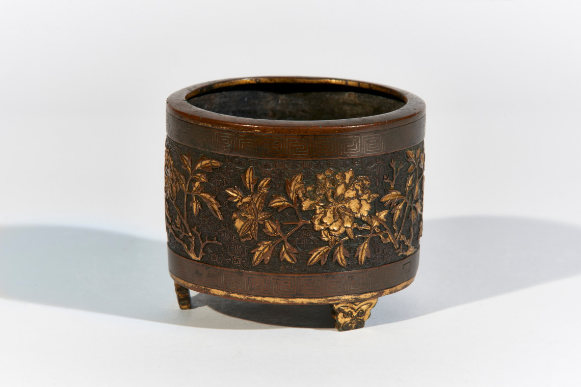 Zu den wertvollsten Stücken gehören eine rote Schnitzlackdose aus dem frühen 15. Jahrhundert, ein um 1350 entstandenes Gefäß aus Bronze in Form eines Tapirs, eine auf 1585 datierte Budai-Figur von Chen Wencheng und ein Wandbehang aus der. 1. Hälfte des 19. Jahrhunderts.