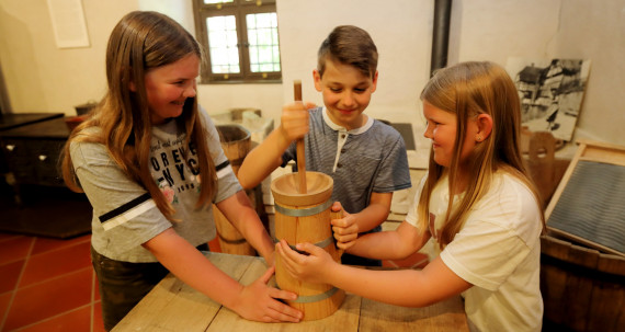 Wie hier beim Buttermachen können Kinder- und Erwachsenengruppen bei den verschiedenen Führungen im Volkskundemuseum selbst aktiv werden.